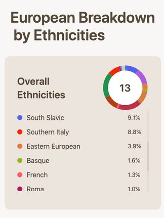 At the same time, the top-level summaries continue to resolve heavily toward Northwestern Europe. This creates a layered profile. The northern assignments reflect later settlement, while the deeper breakdown preserves the earlier Iberian and Mediterranean structure underneath.